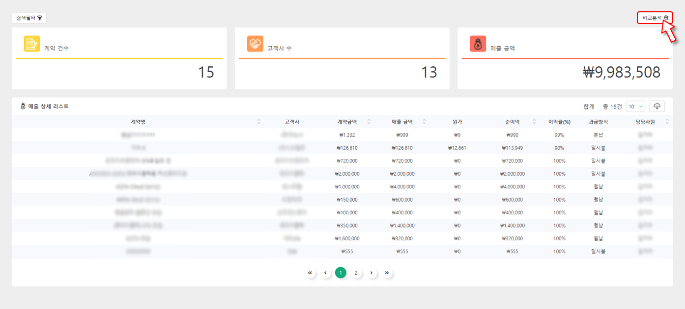 ④ 매출이 발생한 내역을 표시합니다. 계약명과 고객사 명은 물론 순이익, 이익률까지 계산해서 보여드립니다.
