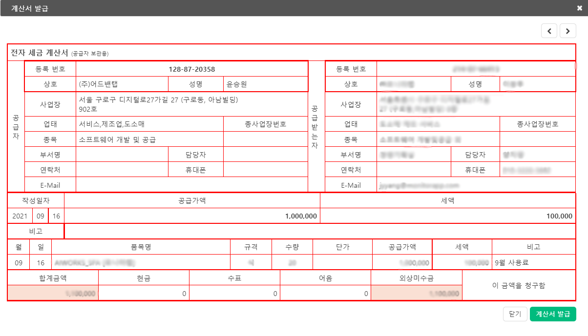 내용을 확인하신 후 ‘계산서 발급’ 버튼을 눌러주세요.