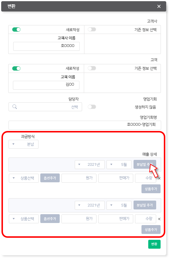 기존에 등록해 둔 고객사 정보나 고객 정보가 있는 경우 스위치를 켜서(