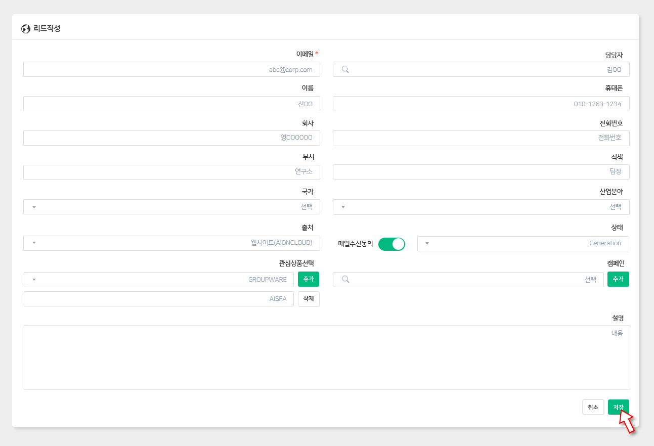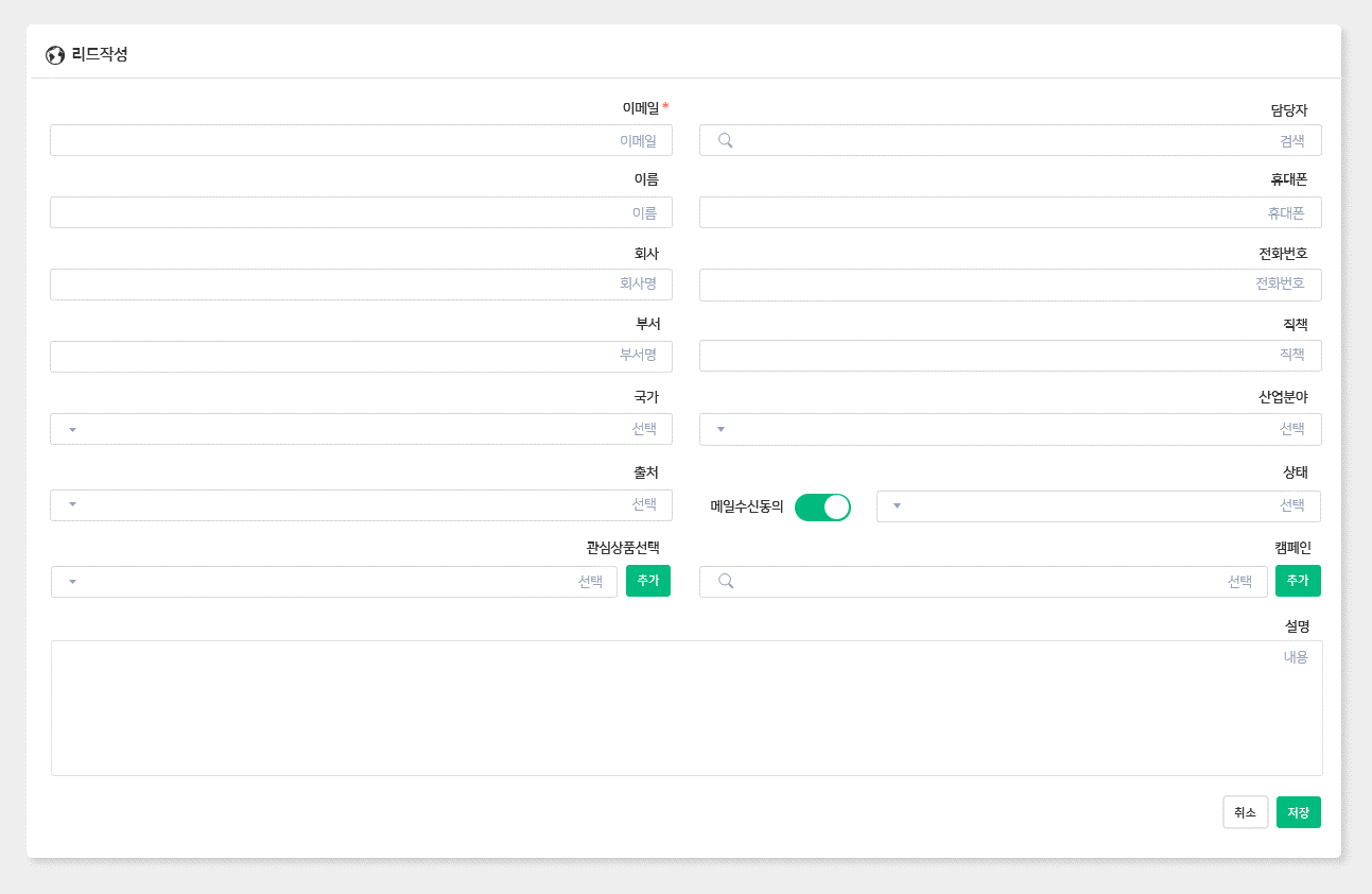 [2단계] 리드를 등록하는 기본 화면입니다. 이메일을 입력하실 경우 자동으로 중복 데이터를 검사합니다.