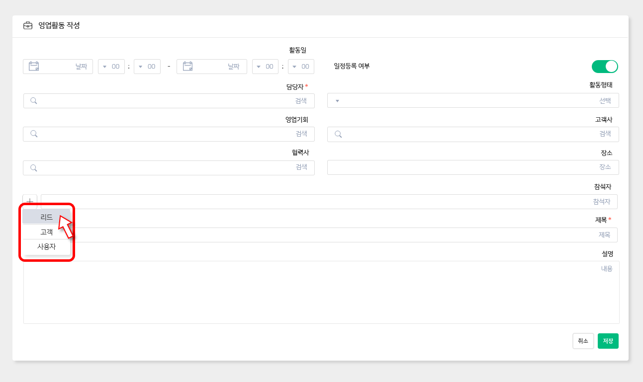 [5단계] 참석자를 선택해주세요. ‘리드, 고객, 사용자’ 중 선택할 수 있습니다.