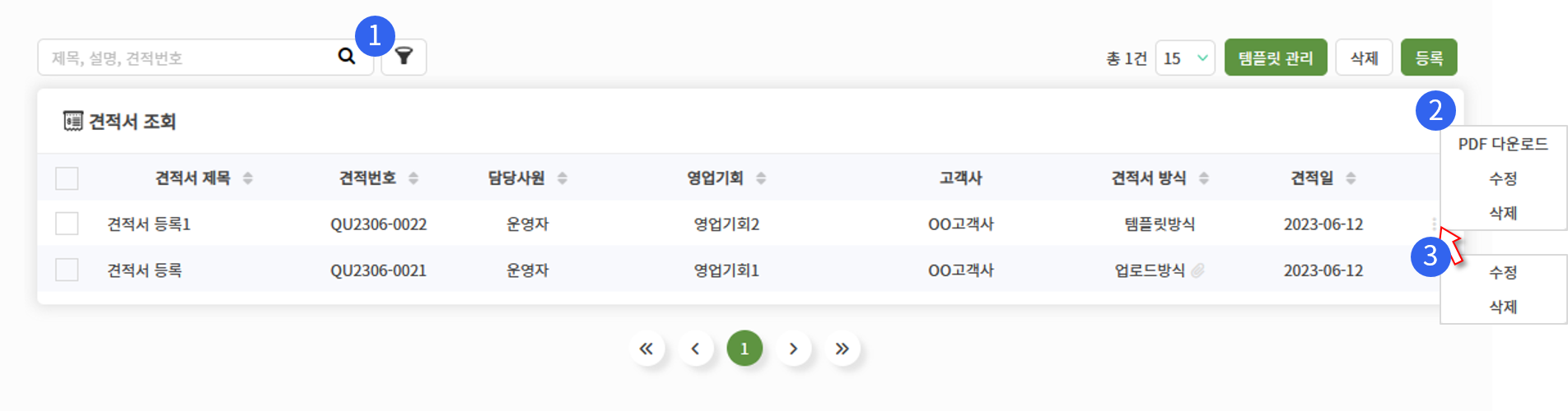 ② (더보기 버튼) 템플릿 방식으로 등록한 견적서는 PDF 다운로드, 삭제, 수정이 가능합니다.